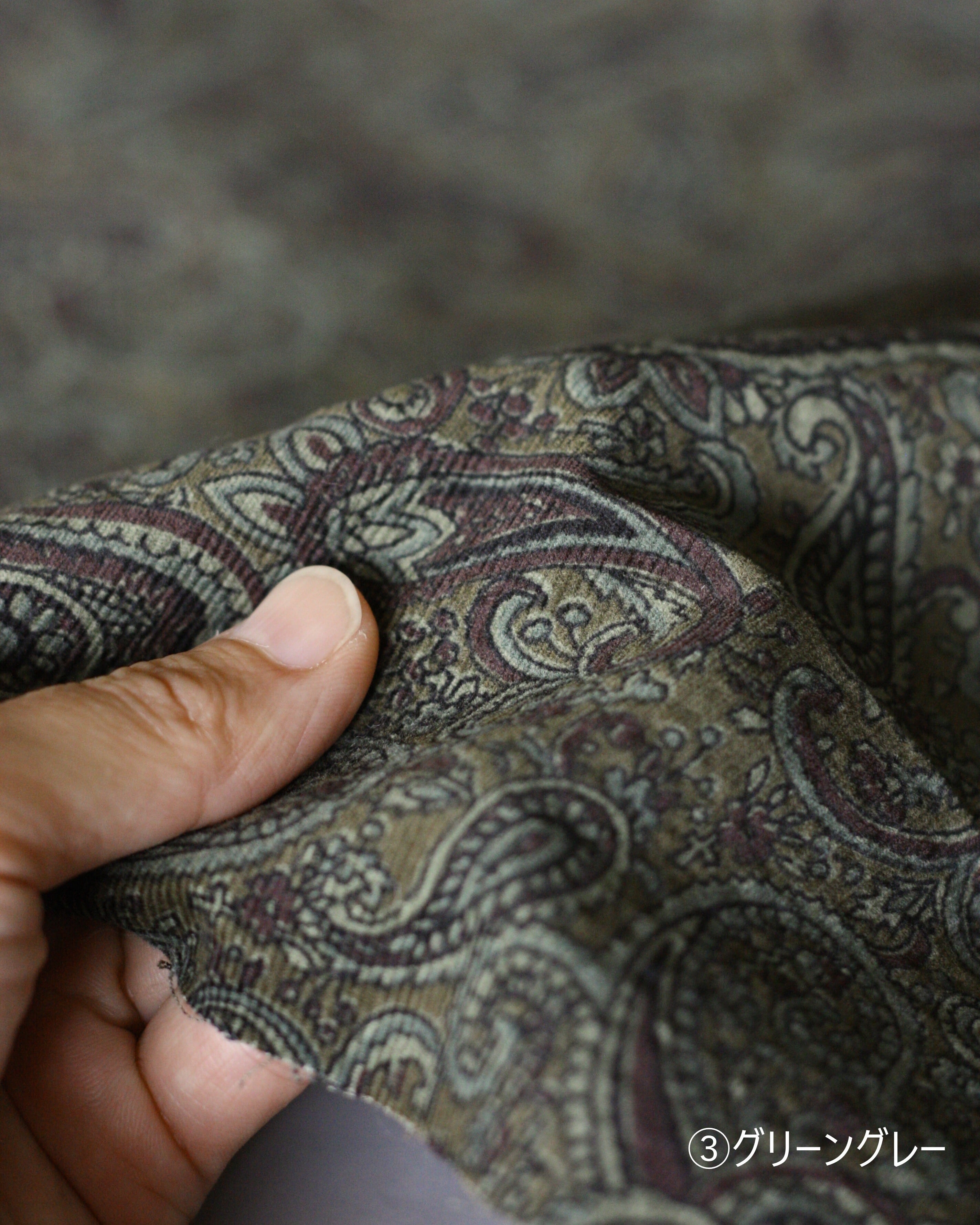 細畝コーデュロイにペーズリー柄がプリントされておりとてもレトロな雰囲気に!